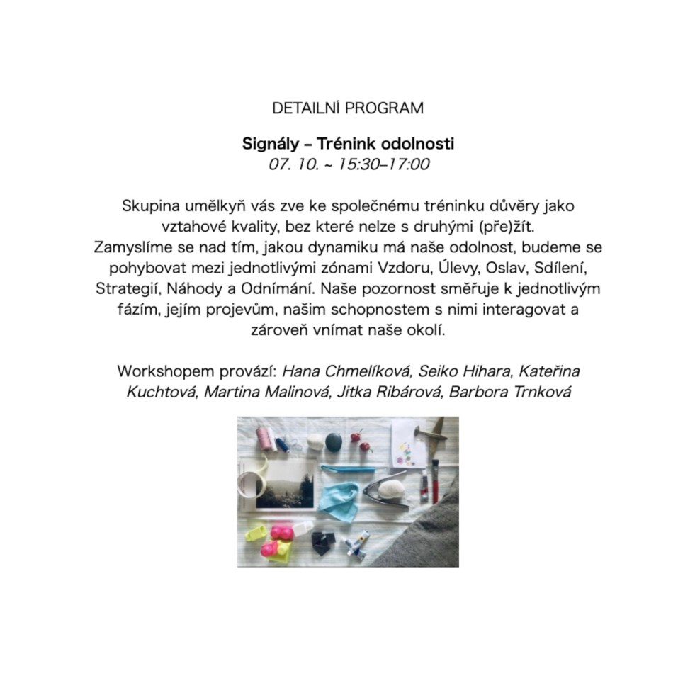 Workshopem provází: Hana Chmelíková, Seiko Hihara, Kateřina Kuchtová, Martina Malinová, Jitka Ribárová, Barbora Trnková