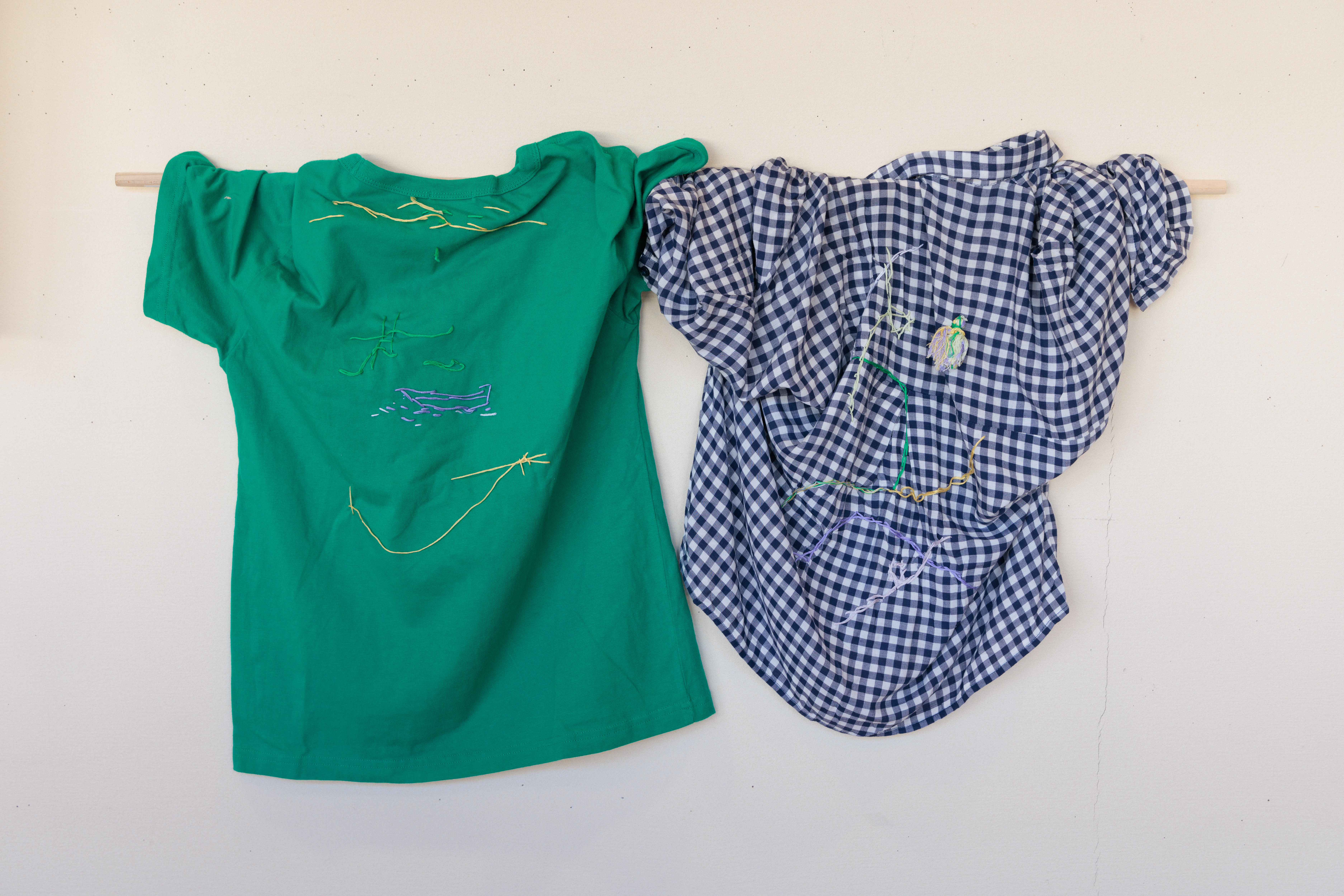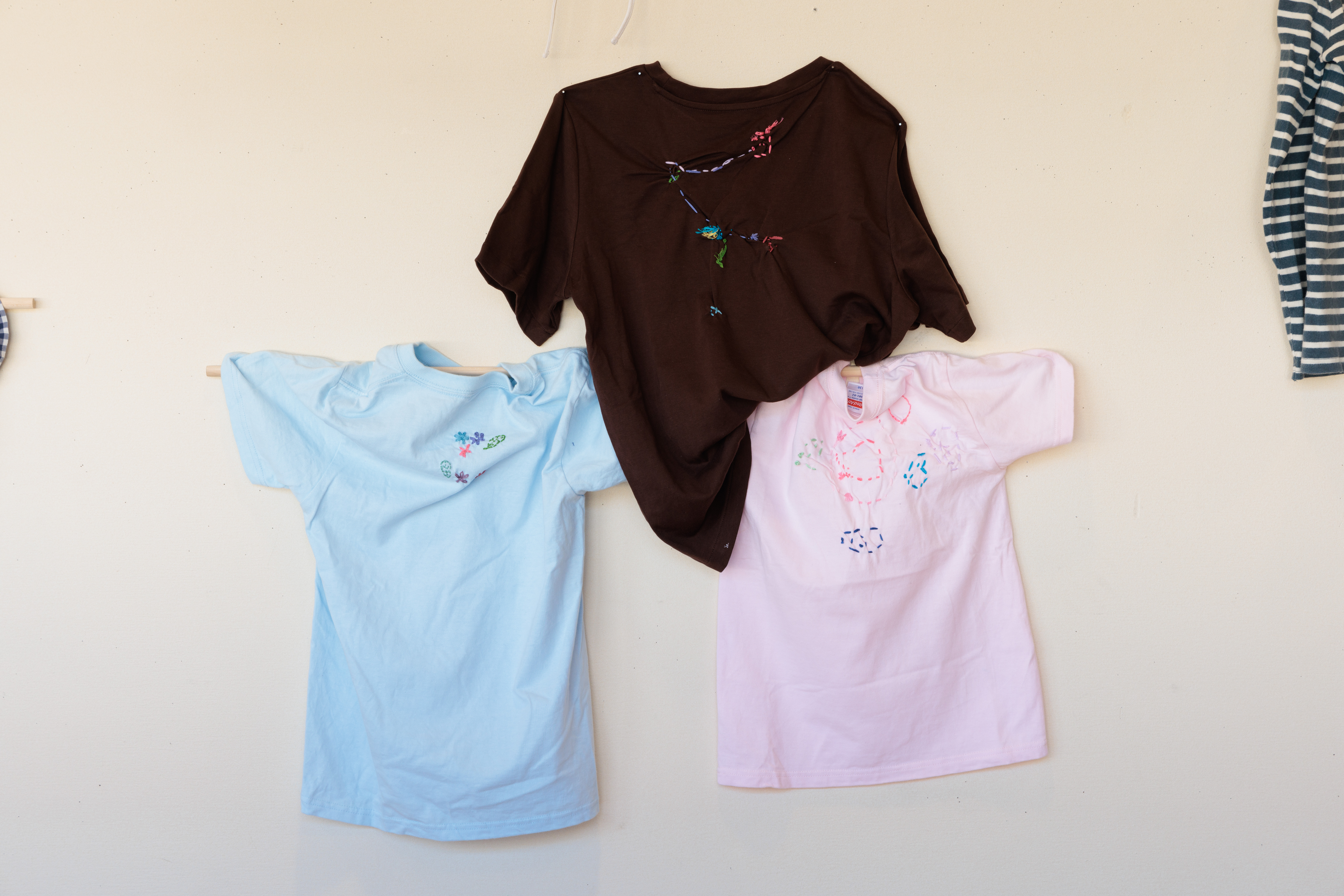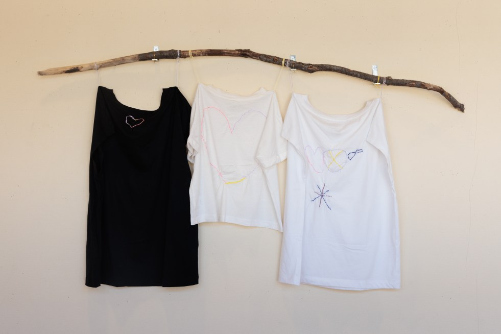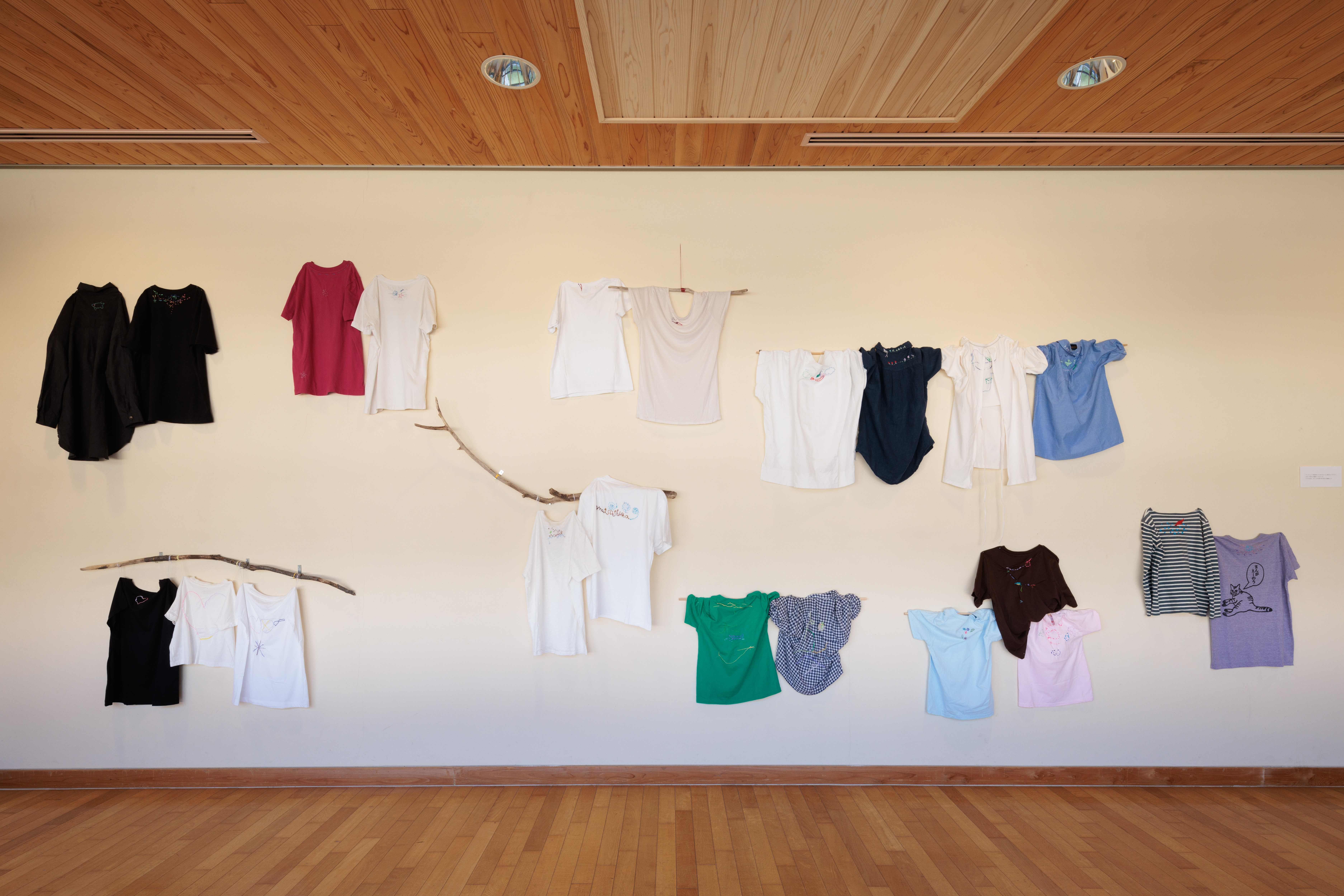 2023年7月に松島分校美術館で行ったワークショップ「旅に出す刺繍をほどこす」で参加者の方々が刺繍してくれた服を借りて展示をします。